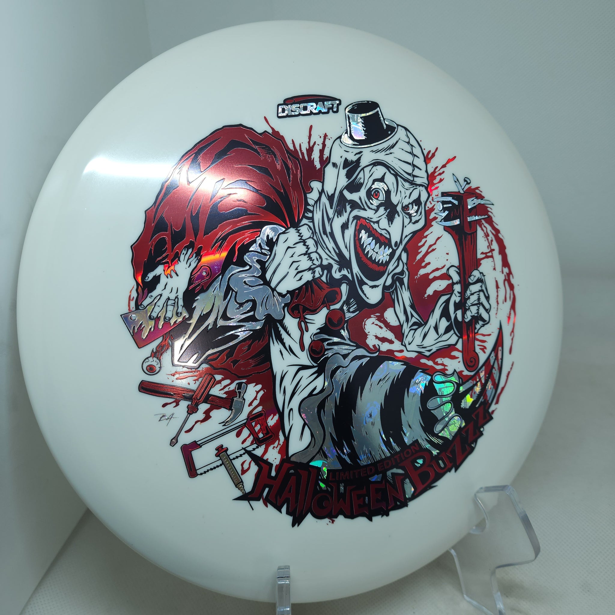 Under the glow of night, the 2025 Tri-Foil Glo Halloween Buzzz emerges from the shadows. An ominous clown silhouette peers from layered foils, casting an eerie shimmer across our classic glow plastic. Precision flight meets bone-chilling style, making this run as haunting in the air as it is on display.